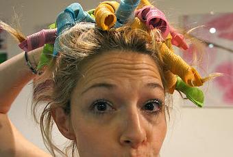Un peu d'eau avec une goutte de mousse coiffante afin d'humidifier chaque mèche, on pose les bigoudis magiques, et hop, 10 minutes d'attente et le tout est bouclé !