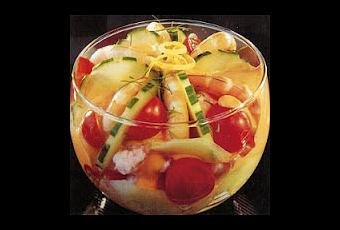 - Éplucher le 1/2 concombre, le couper en très fines lamelles et en tapisser l'intérieur des coupes.