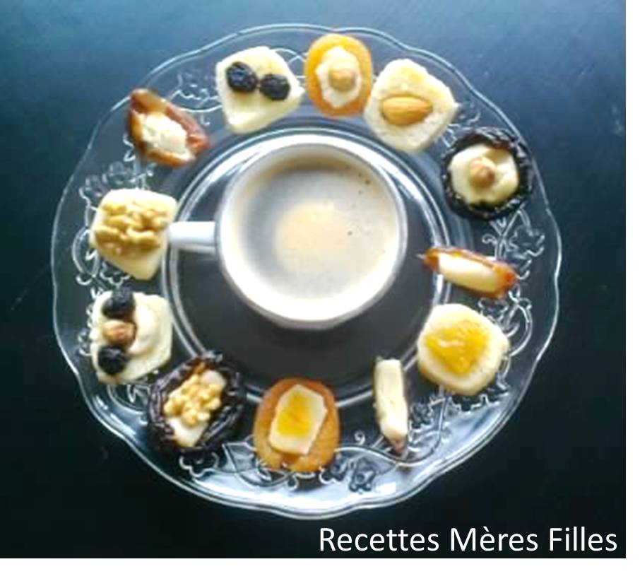 Pour accompagner le café, il faut réaliser des mignardises (comme sur la photo)Il suffit de fourrer des dattes, pruneaux, figues ou abricots secs de pâte d’amandes.On ouvre délicatement les fruits secs avec un couteau et on les garnit.Pour les noix, noisettes, noix de cajou et de pécan et raisins secs, on confectionne un petit carré de massepain que l’on garnit du fruit sec.Et surtout, laissez libre cours à votre imagination.Les jeunes enfants sont particulièrement doués pour réaliser des mignardises originales, surtout s’ils ont l’habitude de réaliser des sujets en pâte à modeler…