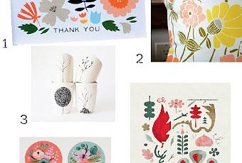 1 . Carte de remerciement , Mélanie Linder.  2. Housse de coussin, Leah Duncan.  3. Mugs Quatre Saisons.ici.  4. Dessous de verre, Rifle paper co.  5. Affiche Botanique, Sarah Andreacchio.