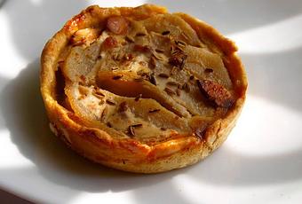 Placer les poires dans les fonds de tartelette précuits en intercalent ici et là des amandes grillées. Verser dessus la migaine. Puis placer au four 25 mn à 180°. Au bout de 15 mn, ajouter dessus quelques graines de fenouil.