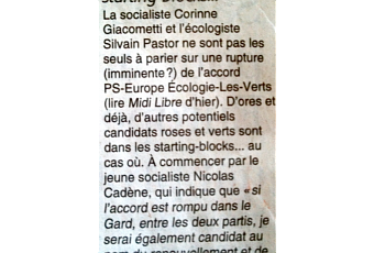 Suite au communiqué retranscrit ci-dessous de la coordination d’Europe Écologie Les Verts, j’ai rappelé qu’en cas de rupture de l’accord PS-EELV (qui aurait lieu notamment si EELV présente, contre l’accord, des candidats sur les 1ere et 2de circonscriptions du Gard), je serai candidat à la candidature sur la 6ème circonscription au titre du renouvellement et de la rénovation (non-cumul).