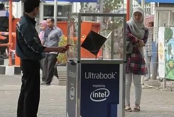 L’une de ces vidéos présente sur la chaîne YouTube d’Intel nous montre à quel point cette tentation peut être forte. En effet l’équipe marketing d’Intel s’est amusée à placer dans trois villes différentes un ultrabook enfermé à l’intérieur d’un cube en verre avec à disposition un brise glace. Sur ce cube en verre Intel a inscrit « Brisez la glace pour obtenir un ultrabook ». Au départ hésitant les passants n’ont pas pu résister à la tentation de s’emparer du brise-glace, vous devinez la suite…
