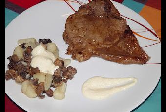 Faire cuire les pommes de terre dans de l'eau avec un peu de sel et couper en petit morceau. laisser refroidir. faire revenir quelques minutes les champignons dans une poêle avec un peu de beurre et laisser refroidir également puis mélanger aux pommes de terre. Préparer la sauce au curry: mélanger le fromage blanc, la mayonnaise , le curry avec un peu de sel et de poivre. bien remuer pour avoir une bonne consistance. rajouter du curry selon les envies ou du piment si vous voulez une sauce un peu piquante. Griller la viande en arrosant du reste de marinade pour qu'elle reste tendre. Dresser avec la salade de pomme de terre couverte d'une cuillère de sauce au curry.