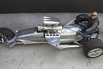 Par contre, sa bécane, c'est une tuerie. Il a appelé son concept The Rocket II et c'est à mi-chemin entre un trike et un véritable dragster, le moteur est un gros V8 Hemi de 1000 cv assez puissant pour éviter de se faire doubler sur l'autoroute. Ce véhicule unique et super bien fait a été conçu par rapport à son cahier des charges chez des artisans spécialisés dans les projets sur mesure du même genre, les Blastolene Brothers. Allez faire un tour sur leur site, c'est impressionnant. Je ne connais pas le prix de l'engin mais c'est superbe et ça a vraiment de la gueule.