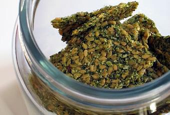 Lorsque j'ai fait mes lasagnes printanières, après avoir passé mes courgettes à la mandoline, il me restait des morceaux que j'ai mixé avec le jus d'un demi citron pour obtenir environ 2 oz d'un mélange bien vert que j'ai utilisé pour faire des craquelins.4 oz de graines de lin blond4 oz de graines de courge moulues8 oz d'eau1 cuillère à café de nori séchéUne pincée de fleur de sel