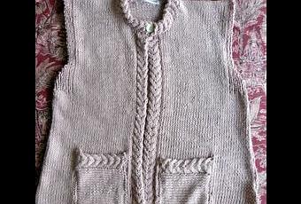 Devants : à tricoter de préférence en vis-à vis sur la même aiguille avec deux pelotes pour que les diminutions et les dessins de la torsade soient symétriques. Monter 51 mailles. Tricoter 42 mailles endroit, une maille envers et 8 mailles endroit pour le demi-devant gauche (pour la torsade) 8 mailles endroit, une maille envers et 42 mailles endroit pour le demi-devant droit. Faire le même travail que pour le dos sur les côtés tout en montant les deux torsades du milieu en vis-à vis. A 29/30cm commencer les emmanchures semblables à celles du dos, continuer les torsades du milieu jusqu’à l’encolure (40/41 cm) : rabattre de chaque côté 8 mailles puis 3 m., 2 m, 2 fois 1 maille. Continuer droit pour atteindre exactement le même nombre de rangs que pour le dos et rabattre à l’endroit sur l’envers.