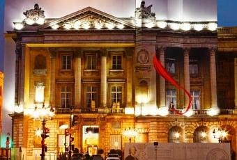 La bâche en trompe l'oeil de l'Hôtel de Crillon situé place de la concorde à Paris a été recyclée en 450 sacs et pochettes qui vont être vendus au profit d'une association caritative.