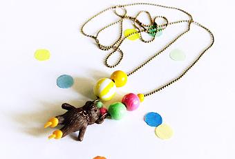 Collier "patinage artistique, jaune"composé d'un ours brun en plastique qui porte au cou une "médaille" en laiton doré, de perles en bois peint et plastique, d'une breloque émaillée orange et d'une breloque lunettes de soleil trendy. Chaîne boules en laiton vieilli. Longueur totale: 47 cm. Taille de l'ours: 4 cm. Pièce unique.Prix: 18 €