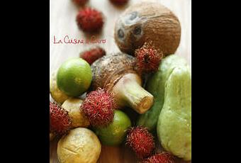Une noix de coco des îles, une dachine, deux christophines, des citrons verts, des maracoujas (fruits de la passion) et des ramboutans ! De jolies couleurs et des saveurs extraordinaires...