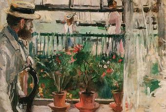 Eugène Manet et sa fille dans le jardin de Bougival Collection particulière Sous un arbre aux grandes branches vertes,papa est assis,un carton sur les genoux,il a un grand chapeau de paille sur le tête et est vêtu de toile grise,il est extrêmement ressemblant;il regarde avec les yeux d'un père cette petite fille blonde en robe blanche très occupée à faire marcher des petits bateaux sur une pièce d'eau.