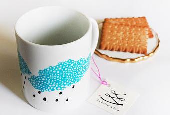 Mug "nuages et gouttes de pluie" en porcelaine illustré à la main dans notre atelier. Résistant au lave-vaisselle et micro-ondes. Vous sentirez le fin relief de l'illustration sous vos doigts. C'est une pièce unique car dessinée à la main. Ne pas utiliser d'abrasif au nettoyage.