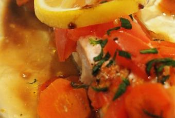 Avant de servir, ouvrir les papillotes, ajouter un peu de menthe ciselée et un filet de vinaigre balsamique.