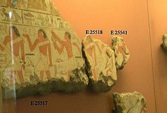 Ce matin, vous me permettrez de n'accorder mon attention qu'à ceux rencontrés chez Metchetchi ou, plutôt maintenant, en salle 5 du Département des Antiquités égyptiennes du Musée du Louvre et qui, au début de la seconde partie de la vitrine 4 ², défilent sur les fragments E 25517, (41 cm de hauteur pour 56 de long), E 25518 (22 cm de haut et 22,5 de long) et E 25541 (16 cm de haut et 15 de large) en dessous du registre des offrandes aux teintes - dont le bleu - magnifiquement bien conservées, surmontés qu'ils sont par un bandeau de superbes hiéroglyphes colorés.