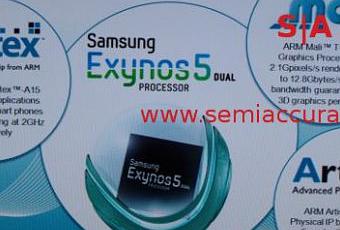 L’Exynos 5 est un processeur double coeur ARM A15 cadencés à 2 GHz. Il sont secondés par un GPU 4 coeurs Mali T-604 MP4. Le commentaire du blogueur est le suivant : « n’attendez pas ce processeur dans un mobile avant les prochaines technologies de batterie« .