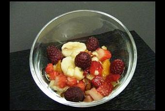 La salade du jour : banane/pomme/fraise/framboise/clémentine/fruit de la passion/noisettes concassées/HE "fresh"