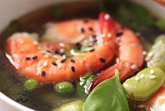 Répartir les légumes et les crevettes dans les bols, verser le bouillon bien chaud. Finir par quelques feuilles de basilic, parsemer de graines de sésame (facultatif) et servir bien chaud.