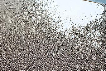 Une table, base rectangulaire où son périmètre est légèrement surélevé permettant de contenir plusieurs milliers de roulements à billes. Un mouvement cinétique, d’une minute environ projette l’ensemble des billes d’un bout à l’autre de la table. La ressemblance visuelle et sonore avec les mouvements marins est saisissante.