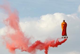 L’artiste performeur chinois Li Wei est habillé en moine et suspendu au bout de deux câbles par une grue à une quinzaine de mètres au-dessus du sol.