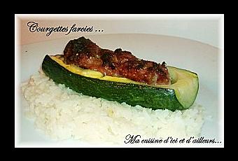 Bonjour, je vous propose des courgettes farcies d'inspiration indienne... Le riz servi avec les courgettes a cuit dans le plat à gratin avec les légumes. Pour 4 personnes, il vous faut: 400 gr de chair à saucisse 4 courgettes 1 cuillère à café de piment en poudre 1 cuillère à café de graines de moutarde 1 cuillère à café de cumin moulu 1 cuillère à café de curcuma 300 gr de riz sel Mélangez la chair à saucisse avec toutes les épices. Attention ne salez pas !!! Lavez les courgettes et fendez-les en 2 dans le sens de la longueur. Creusez-les et répartissez la chair à saucisse dans chaque portion. Répartissez le riz dans le fond du plat, disposez les courgettes sur le riz et recouvrez le riz d'eau salée. L'eau doit recouvrir entièrement le riz. Enfournez à 200° pendant 35 minutes environ. Vérifiez la cuisson du riz avant de retirer la plat du four et ajoutez un peu d'eau si besoin. Servez chaud et bon appétit !!!