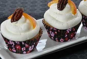 Pour 12 cupcakes : 200g de farine, 1 oeuf, 30g de cassonade, 65ml d'huile de canola (ou autres huiles au gout neutre), 125ml de sirop d'érable, 65 ml d'eau chaude, 5ml de levure chimique (poudre à pâte), 1 ml de bicarbonate de soude, une dizaine d'écorces d'oranges confites (+ 12 autres pour la déco), environ 150ml de crème à fouetter autorisée (pour moi celles-ci ou celle-là), 1/2 càc d'extrait d'orange et quelques noix de pécan caramélisées à l'érable pour la déco (facultatif).