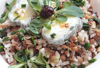 - Mélanger le riz, les lentilles, les noix, les cranberries, les bouquets de mâche, la ciboulette et les morceaux de fromage.