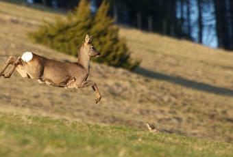Il a suffit d’un craquement de branche causé par un promeneur impromptu pour que cette chevrette qui broutait dans un pâturage boisé prenne la fuite en direction de la forêt. Posté au bon endroit et au bon moment, cela m’a permis de la saisir en plein bon, et de réussir une bonne image…