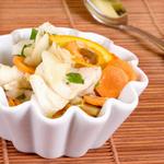 Ajoutez l’autre moitié de légumes, arrosez avec l’autre moitié d’assaisonnement, salez, et parsemez de raisins et d’amandes.