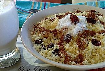 Pendant ce temps ,Mettez les raisins secs à gonfler dans d'eau tiède.Remettre la semoule dans le plat en laissant le couscoussier sur le feu. n écrasant légèrement les grains de la semoule avec une louche.Laisser refroidir et ajouter 2 verre d'eau en mélangeant bien le tout.