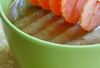 6 oz de patate douce coupée en petits et fins morceaux1/2 courgetteLe jus d'une demie orangeLe jus d'un demi citron1 gousse d'ail1 morceau d'oignon pas trop gros1 cuillère à soupe de purée de sésame crue1 cuillère à café de miso1 petite cuillère à café de purée de datteQuelques tours de moulin à poivreEau