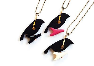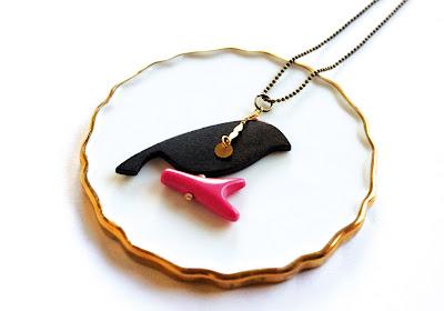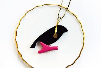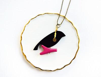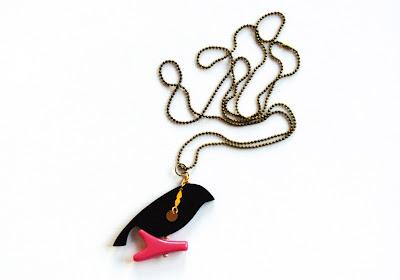 Ce matin ensoleillé, l'oiseau sur la branche, regarde passer le temps.Collier "Bird, rose" composé d'un oiseau noir dans une découpe de bois (0,4 cm d'épaisseur, 6 cm de largeur) posé sur la branche rose en acrylique accompagnée de petites perles de rocailles bronze pastel et chaîne et sequin en laiton doré. Chaîne boules en laiton vieilli. Longueur totale: 46 cm environPrix: 22 €