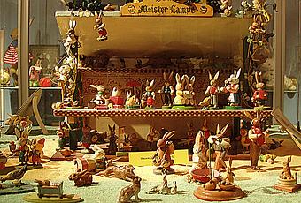 Une vitrine de lièvres de Pâques au ZAM de Munich