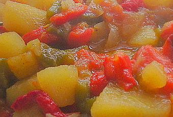 8. Quand les pommes de terre sont presque cuites ( en touchant avec le doigt) ajouter les poivrons, et continuer la cuisson encore 15 min, toujours à feu doux.
