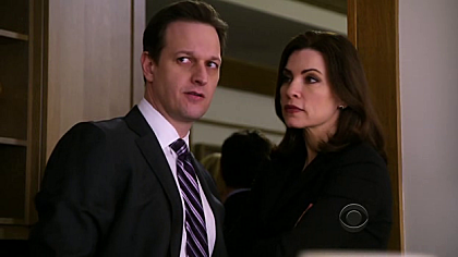 En ce qui concerne l’affaire du jour en elle-même, comme souvent, je regrette que la série n’accorde pas plus d’importance au parti défendu par le cabinet, ici l’épouse d’un des salariés poussés au suicide par leur entreprise, ce qui ampute d’un certain potentiel émotionnel. Je suis tout de même dans l’ensemble satisfait du traitement du sujet, dont le choix est d’ailleurs tout à l’honneur de The Good Wife, le suicide au travail n’étant pas un thème des plus évidents à aborder. Ce que j’ai trouvé intéressant c’est que si les torts des employeurs sont avérés, on suggère aussi que ce genre de situation n’est pas aussi simple avec ici des salariés loin d’être tout à fait des anges. C’est d’autant plus réaliste et permet quelques twists intéressants.
