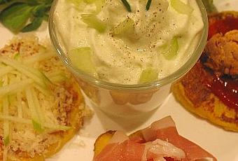 Pour apporter un peu de fraîcheur dans cette assiette, j'ai réalisé une chantilly de concombre. Réserver quelques dés de concombre. Mettre dans le blender : le concombre épluché et taillé, de la crème liquide, de l'ail déshydraté, du sel, du poivre. Mixer. Filtrer et mettre au siphon. Servir au dernier moment.