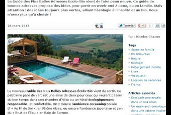 Le Guide des Plus Belles Adresses Écolo-Bio vient de faire peau neuve. Ce guide de bonnes adresses propose des idées pour partir en week-end en amoureux, ou en famille. Mais attention : des idées toujours plus vertes, alliant l’écologie à l’insolite et au bio. Vous n’avez plus qu’à choisir !