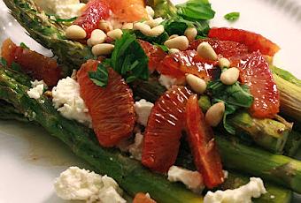 pour 2 personnes : 1 botte d'asperges vertes 1 orange (sanguine ) 60 gr de feta 20 gr de pignons de pin basilic 1 cuil à café de crème de balsamique (blanc si possible ) huile d'olive
