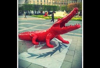 Et soudainement je bute contre un obstacle .. le temps de relever le nez de mon smartphone, en m’excusant déjà auprès du passant bousculé quand .. Aaaaaahhhh ! Un crocodile rouge, et donnant l’air d’être de fort méchante humeur qui plus est .