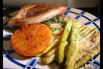 2 Magrets de canard,1 Cèleri blanc,des Asperges,2 clémentines,un peu d'huile d'olive,du persil,du parmesan.