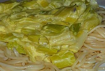 Une fois les poireaux cuits, ajouter la crème et le curry. Mélanger aux pâtes et servir aussitôt.
