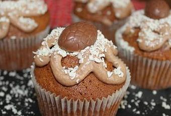 Etalez un peu de ganache sur le dessus, saupoudrez de chocolat blanc et décorez avec un oeuf au praliné.