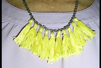 Il vous faut: une chaîne (j'ai trouvé la mienne chez Emmaüs), des écheveaux de coton de couleur jaune en l'occurence ici, 10 petits anneaux (comme je n'en avais plus, je les ai récupérés sur un vieux collier, mais vous pouvez les trouver à la Droguerie), un morceau de carton fin de 8cm de large à plier en deux et une petite pince.