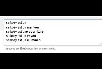 Eh oui : menteur, pourriture, voyou et illuminati sont les premières propositions que le moteur de recherche mondialement connu récupère instantanément, et qui en disent finalement assez long sur le personnage et la façon dont il est vu par les internautes. Rappelons que cette fonctionnalité est basée sur les recherches les plus souvent menées par les millions d’internautes qui le contactent… Notez qu’en anglais (« sarkozy is a »), on produit une liste aussi fleurie (jew, idiot, racist).