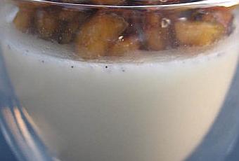 Pour la panna cotta : Mettre le lait, la crème liquide et le sucre à bouillir avec les graines de la gousse de vanille. Délayer l'agar agar dans une pointe d'eau et l'intégrer au lait. Laisser bouillir encore 3 mn. Retirer du feu et verser dans les verrines. Réserver au frais.