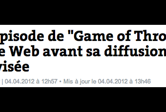 “Le deuxième épisode de la saison 2 de la série à succès ‘Game of Thrones’, diffusée aux Etats-Unis par la chaîne HBO, a semble-t-il été mis en ligne par erreur sur HBO Go, le système de télévision de rattrapage de la chaîne. Téléchargé par des utilisateurs, l’épisode a été diffusé sur plusieurs réseaux de téléchargement en P2P ou de streaming illégal.”