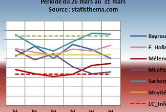 - Quant aux quatre autres candidats, leurs performances respectives sur cet axe a semblé marquer un resserrement général. Mais on peut observer que François Hollande et Jean-Luc Mélenchon "ont pu" se distinguer légèrement par moment (le 27 mars pour Hollande et les 29 et 30 mars pour Mélenchon).