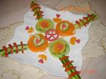 Disposer les carottes et les concombres en forme de nids. Disposer des quartiers d'oranges et d'avocats au centre de chaque nid. Décorer de coeur de mortadelle et assaisonner de crème de coco. C'est très bon et très raffiné comme assaisonnement et c'est surtout plus léger que la mayonnaise.
