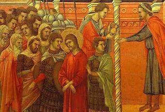 Ponce Pilate se lavant les mains, extrait de la fameuse Maestà de Duccio di Buoninsegna. Détrempe sur bois de 214 x 412 cm, peinte pour la cathédrale de Sienne. Initialement, elle était portée en procession dans les rues de Sienne lors de cérémonies religieuses. La Maestà est une composition grandiose peinte des deux côtés, que les vicissitudes historiques ont privée de son cadre et de quelques parties secondaires. Ce remarquable polyptyque, salué comme un chef-d'œuvre et comme le symbole même de la cité de Sienne, constitue un jalon essentiel dans l'évolution de la peinture, issue de la tradition byzantine, vers un art visuel plus descriptif.