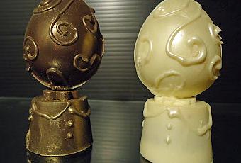 Juste pour le plaisir, voici des oeufs en chocolat qui pourront décorer la table du dîner de Pâques.Ce sont des moulages en chocolat noir et blanc que j'ai décoré au cornet puis montés sur un petit socle de présentation. Ensuite j'ai brossé chaque oeuf d'une fine couche de poudre comestible ; dorée pour l'oeuf noir et perlée pour l'oeuf blanc.