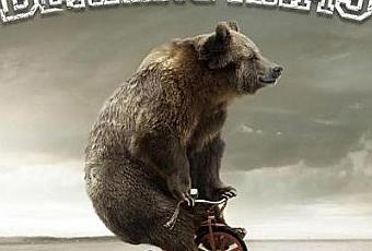 Un ours brun qui fait du tricycle dans un décor désertique sur fond de ciel nuageux lourd et tourmenté, c'est ainsi que nous apparaît la